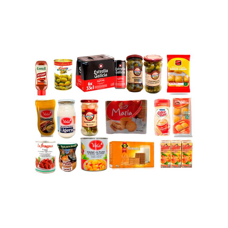 Cerveza importada 6uni Aceitunas verdes sin hueso El Cabildo 295g Magdalenas cuadradas  sabor limón 350g Banderillas enteras dulces El Cabildo 295g Pepinillos enteros sabor anchoa El Cabildo 295g Galletas María leche 4x200g Coffe mate 311.8g Magdalenas cuadradas Tortini vainilla 8uni Cóctel de frutas Vola 1Kg Galletas tostadas 4x200g Néctar Cofrutos Tropical sin azúcar 200ml 6uni Pasta para bocaditos Coosur 450ml Mayonesa ligera Vola 450ml Aceitunas rellenas de anchoa El Cabildo 295g Fresas en almíbar ligero 780g Ketchup Coosur 300g Mostaza Vola 300g